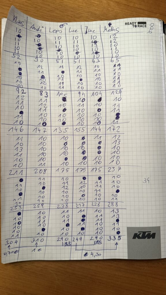 Das Spiel neigte sich dem Ende und wie befürchtet hatte mal wieder Maths die Nase vorn: 335 Punkte vor Andi mit 310 Punkten und Klausi mit 304 Punkten, den Vorletzten Platz teilten sich die beiden Trotteln Lepo und June mit jeweils 290 Punkten und Oberstock Letzter wurde Lue mit nue 249 Punkten was eine Fette Taxi Rechnung von 4,30,- Euro an Mathse bedeutete.