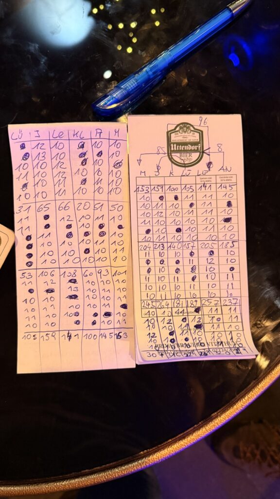 Nichts desto Trotz wurde das Kartenspiel in diesem Klobrillenlosen Fake Irish Pub mit lärmenden Kindern durchgeführt und es Krönte sich zum Stiegenkönig von Napoli der Mathse mit einer Schnapszahl von 333, gefolgt vom 5 Finger Death Punch Lue mit 328 Punkten und Klausi mit 306 Punkten. Vierter wurde Junesko mit 291 Punkten vor dem Flötzinger Original Lepo Gerner Mahanji mit 285 Punkten. Der Oberstock Letzte von Napoli wurde der völlig defizitär spielende Andi mit nur 278 Pünktchen!