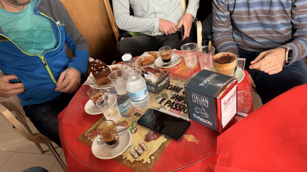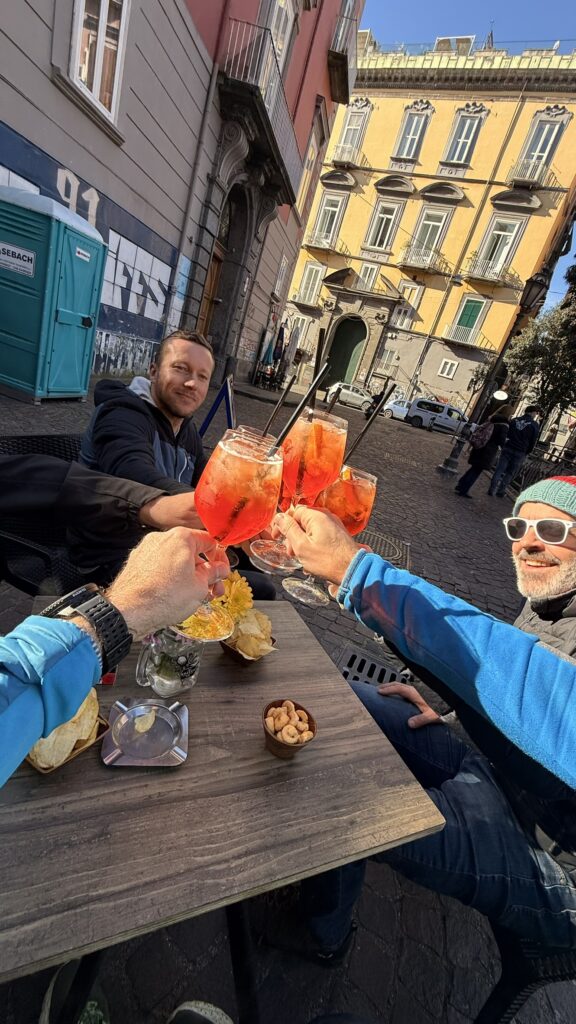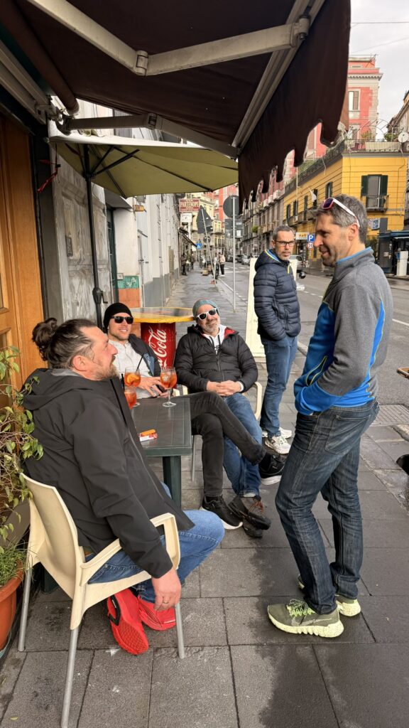 Nach und nach kamen die Trotteln aus den Federn, noch etwas Kaffee bevor es zum Frühschoppen zum Eclettico wo Vater & Sohn uns Willkommen hießen. Toast al prosciutto e formaggio, Dolci & Kaffee, Herrlich, so kann der Tag in Neapel starten obwohl ein Paar Trotteln noch leicht angeschlagen waren.