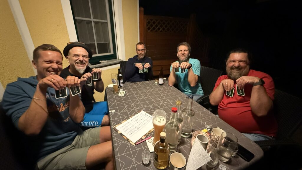 Nach dem Digestif konnte auch sogleich gekartlt werden, umso besser für unsere beiden Raucher da das Spiel ja draußen statt fand. Durchwachsen war die erste Runde, kein Hani auch nicht vom Hanl. Flott ging es durch die 2. Runde, einzig unterbrochen durch ständiges Wasser lassen des Mathse Bathses..