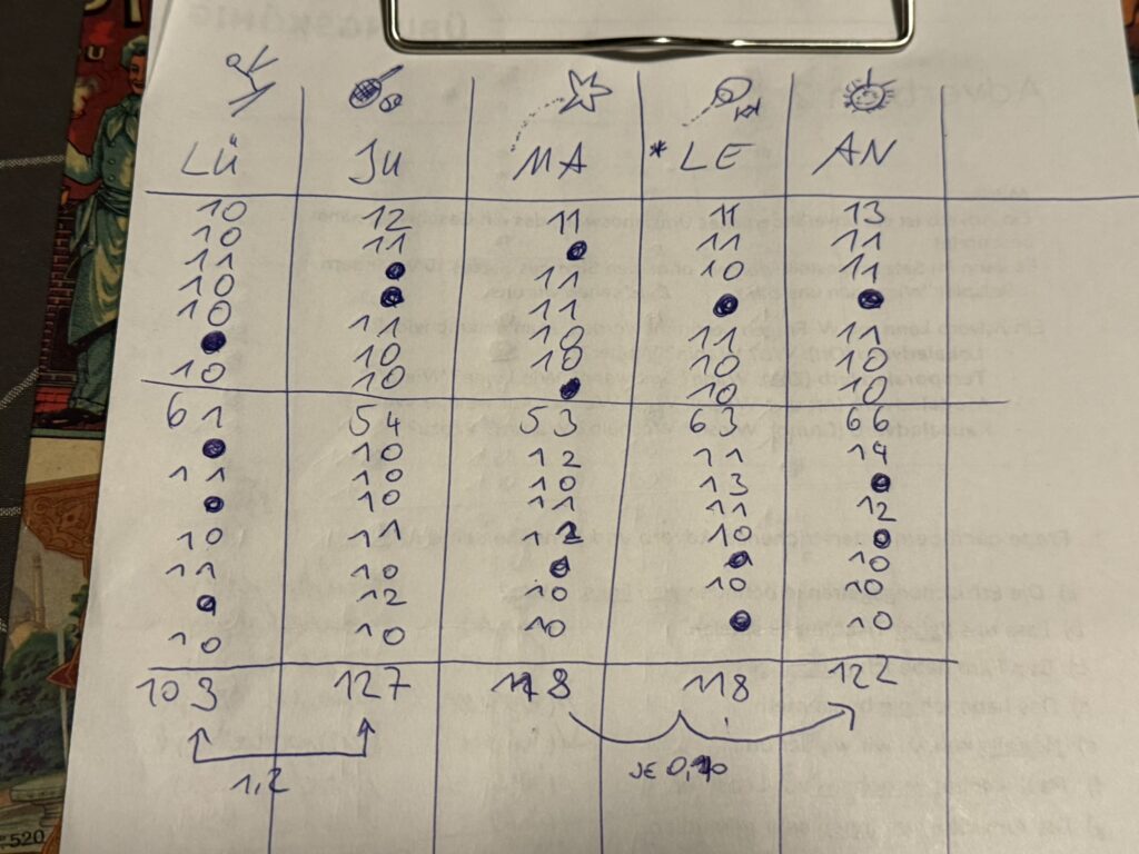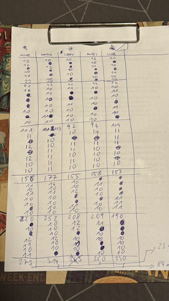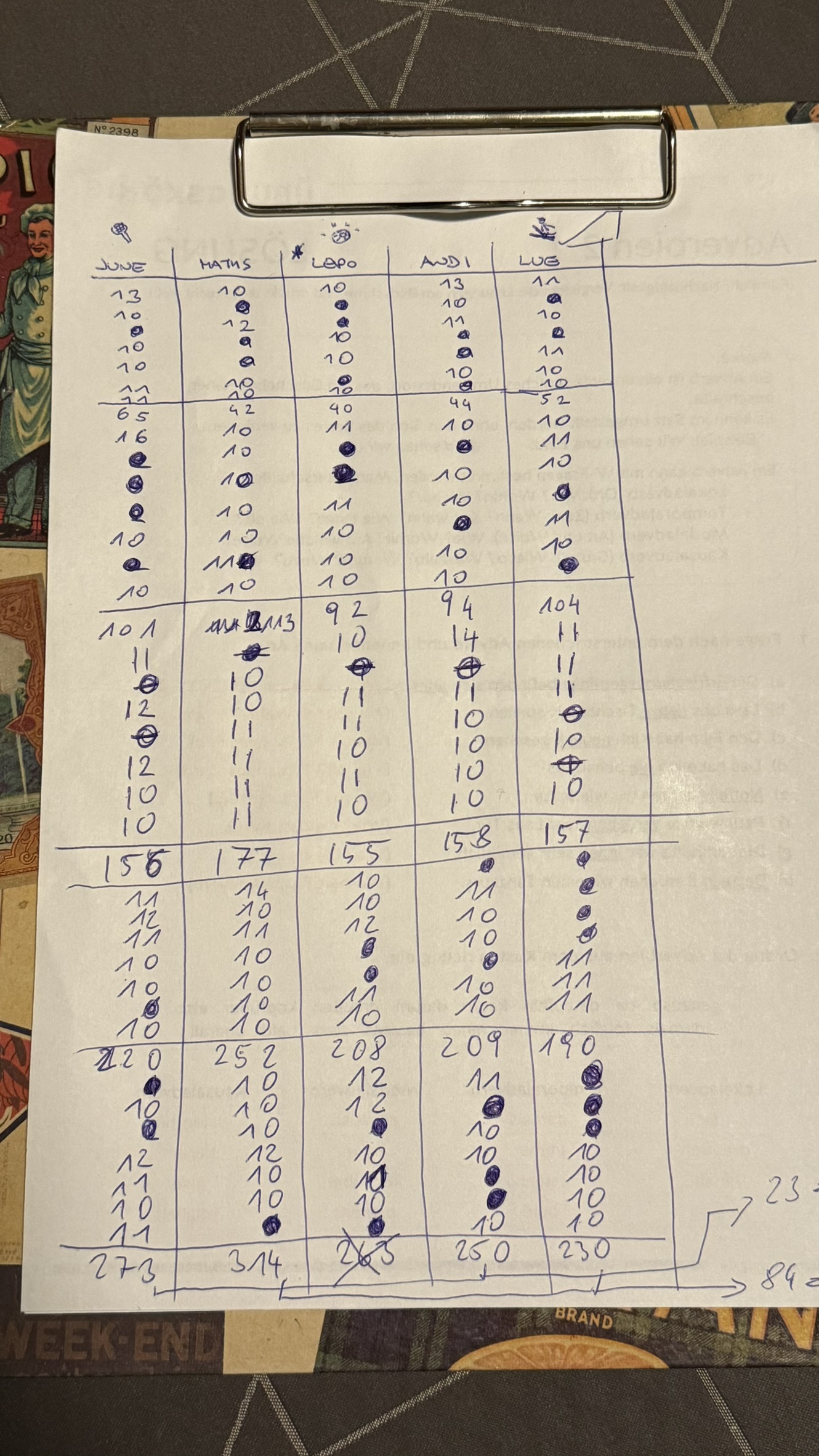 Das Spiel ging schnell voran, einzig unterbrochen vom ständig brunzenden Mathse… Somit kristallisierte sich der erste König der Dr. Daxecker Straße heraus: Mathse (diese mal Mitfahrer) erreichte stolze 314 Punkte, gefolgt vom Junseko mit 273 Punkten und dem Neutralen 3. Platzierten Lepo mit 263 Punkten. Zahlemann & Söhne: 4. Andi (guter Gastgeber) mit 250 Punkten und mal wieder Oberstockletzter Lue mit lächerlichen 230 Pünktchen!