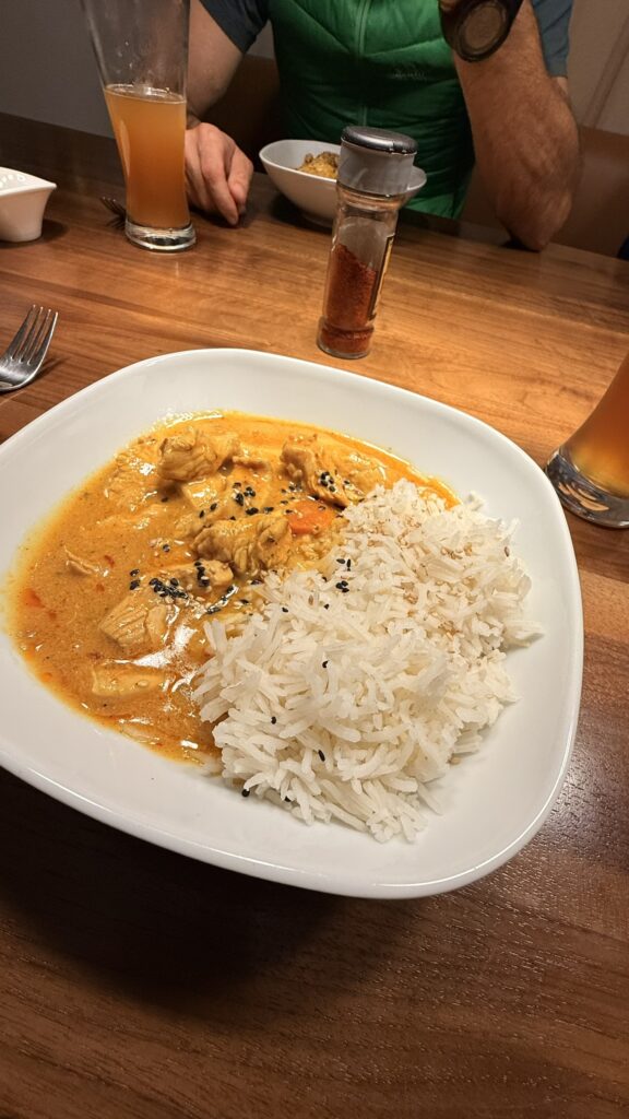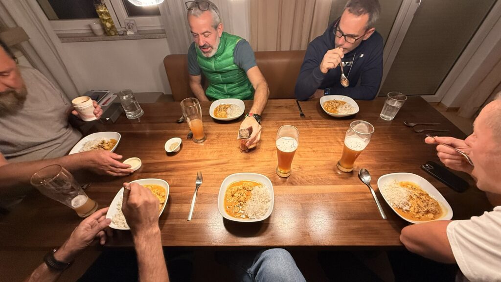 Zum Dinieren reichte Mathse Bathse ein Curry mit Reis und Chicken, was der ganzen Bande sehr gut schmeckte. Dazu reichlich Bier und Säfte für die Anwesenden Schwochschwoaba!