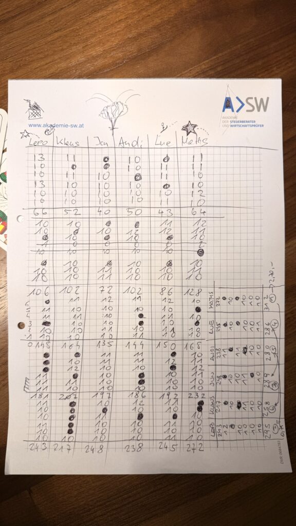 Die Letzte Runde war angesagt und wie schon die restliche Trottelbande das ganze Spiel hinweg vermutete, Krönte sicher der Misarable & Schlechte Gastgeber zum Gewinner im eigenen Haus! Mathse erreichte 312 Punkte vor dem stark performenden Lepo mit 295 Punkten. Dritter wurde der kränkliche Junesko mit 289 Punkten vor Lue mit 286 Punkten. Gefolgt von Schwochschwoaba Andi mit 280 Punkten. Oberstockletzter wurde dieses Mal der völlig schwach spielende, sich aber aus der Affäre um den Eddie de Eagle ziehende Klausi mit lediglich 258 Pünktchen! Was für eine miserable Performance!